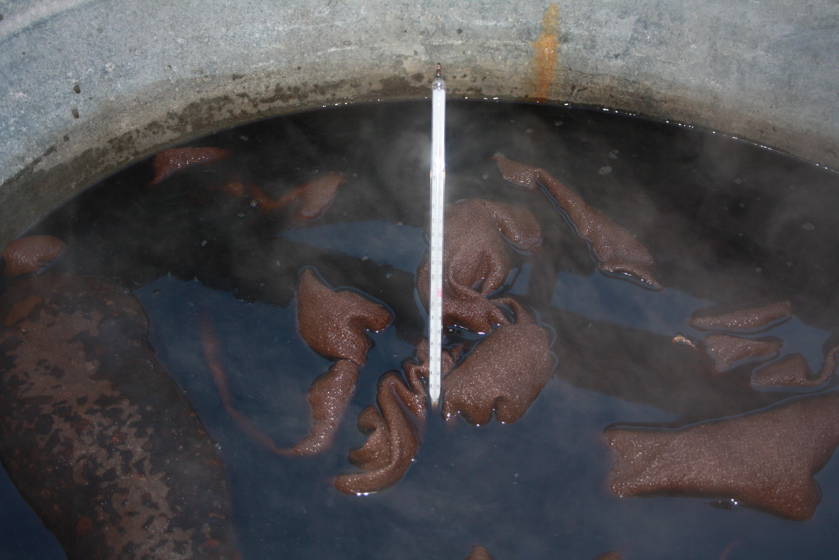 Die Wanne konnte ich mit einem Gartenschlauch gleich mit heißem Wasser auffüllen. Stoff hinein und den Brenner gar nicht mal so dolle aufgedreht.