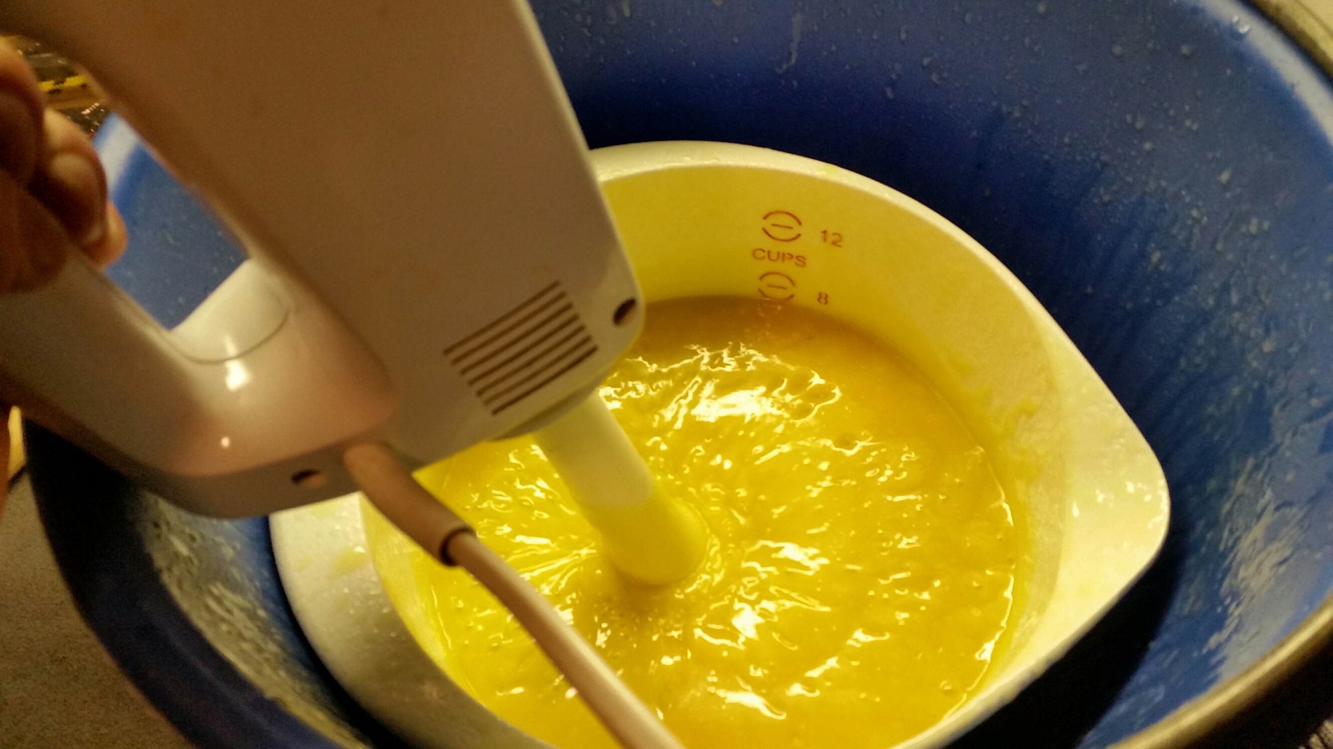 Wie im Video gezeigt, habe ich zunächst eine ganze Zeit, damit meine ich bestimmt 45 Minuten, Lauge und Öle mit einem herkömmlichen Küchenmixer verrührt. Die Teigschüssel habe ich dann recht schnell in einen Eimer gestellt um die Spritzer nicht so ab zu bekommen.